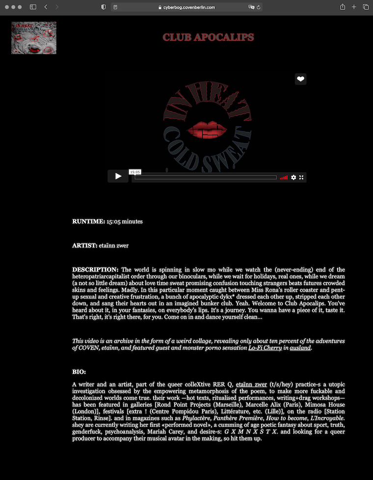 Coven Berlin is a queer feminist transdisciplinary art collective creating art exhibitions, performances, and artworks. In 2019, we received funding to present commissioned multimedia artwork in a public venue in the second half of 2020. Faced with the task of making an artistic program accessible to the public during a Covid-19 lockdown, we turned to the web. We normally use our online magazine as our main digital outlet, but the highly structured format of our magazine’s web template felt less suited to a digital art exhibition.